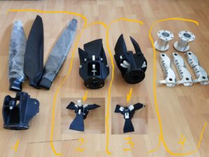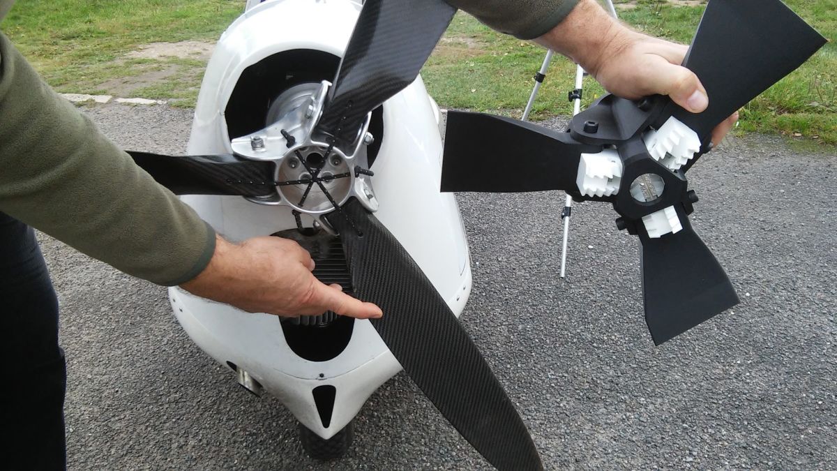 We use HIRTH F-33 – 28 HP engine with BRIGHT STAR SWIFT wings and cage. As it turns out we had a problem with it – we don’t have the appropriate propeller. No results either after searching to buy one. We consulted with our fellow pilots and I decided to make my own propeller. The central part is milled from aluminum, the blade from composite materials. Sail plane manufacturer “AB Sportinė aviacija” at Pociunai airport made destructive tension test of the blade. After a month of strenuous work I had a three-blade 120mm diameter folding propeller that rotates counterclockwise. Weight 2.5kg. Pushing force about 60kgwith HIRTH F-33 at 5500rpm. I was satisfied after the first flight. The good results inspired our team to further design and improve the performance of the propeller. Pictures with red background are from destructive test performed at “AB Sportinė aviacija”. The bottom slide shows our future development. Yellow lines with numbers shows stages of our new designs.